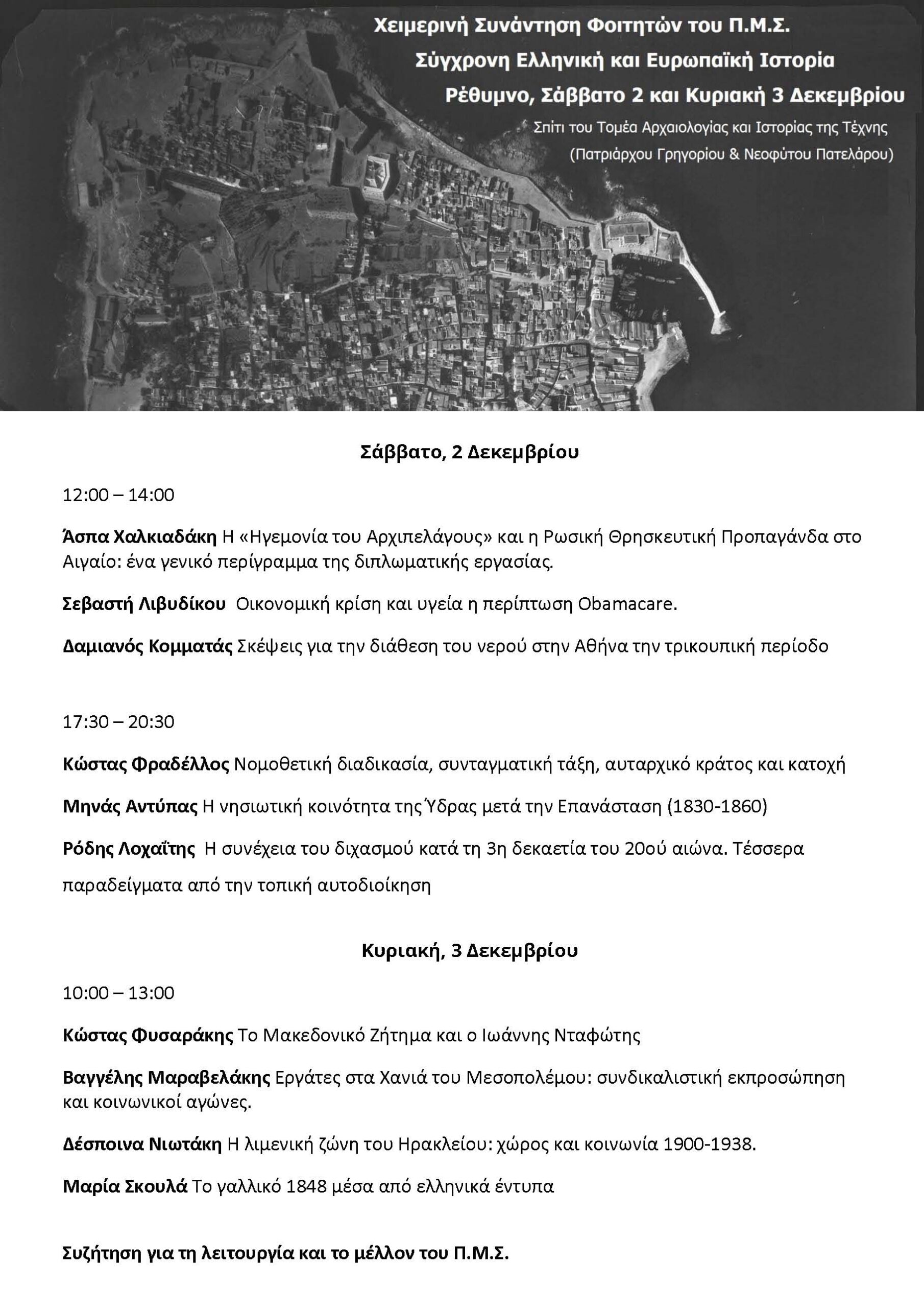 Χειμερινή Συνάντηση Φοιτητών του Π.Μ.Σ. Σύγχρονη Ελληνική και Ευρωπαϊκή Ιστορία | Ρέθυμνο, Σάββατο 2 και Κυριακή 3 Δεκεμβρίου