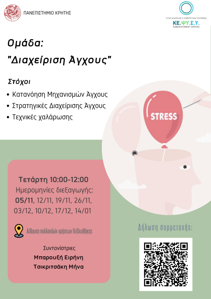 Στόχοι Ομάδας: Κατανόηση των μηχανισμών άγχους, στρατηγικές διαχείρισης άγχους & τεχνικές χαλάρωσης.