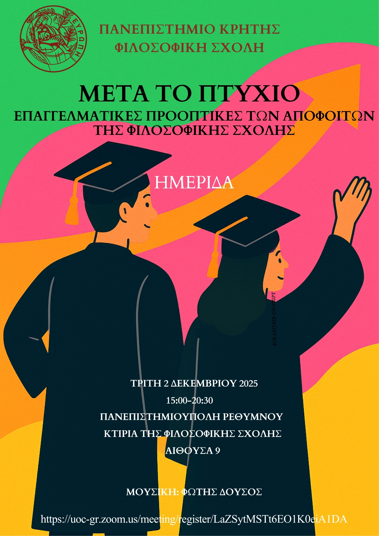 Η Φιλοσοφική Σχολή του Πανεπιστημίου Κρήτης οργανώνει ημερίδα με θέμα “ΜΕΤΑ ΤΟ ΠΤΥΧΙΟ. ΕΠΑΓΓΕΛΜΑΤΙΚΕΣ ΠΡΟΟΠΤΙΚΕΣ ΤΩΝ ΑΠΟΦΟΙΤΩΝ ΤΗΣ ΦΙΛΟΣΟΦΙΚΗΣ ΣΧΟΛΗΣ” την Τρίτη 2 Δεκεμβρίου 2025, από τις 3 το μεσημέρι, στην αίθουσα 9 των Διδακτηρίων της Σχολής.