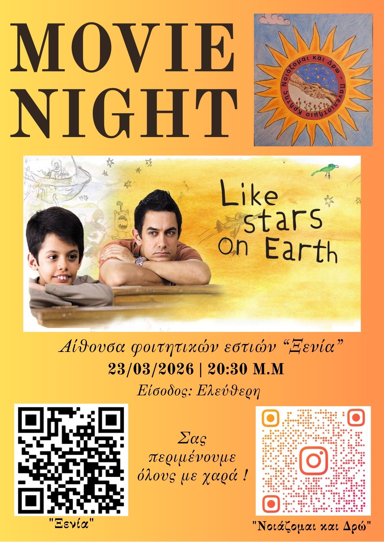 Με μεγάλη μας χαρά σας προσκαλούμε όλους τη Δευτέρα 23/03/2026 και ώρα 8:30 στην Αίθουσα των Φοιτητικών Εστιών “Ξενία” όπου θα πραγματοποιηθεί εκδήλωση προβολής της ταινίας “Like stars on Earth”. Μια ταινία με ένα πολύ σημαντικό μήνυμα για όλους και ιδιαίτερα για αυτούς που θέλουν να ασχοληθούν με την εκπαίδευση. Μετά την προβολή θα ακολουθήσει συζήτηση με τους παρευρισκόμενους.
