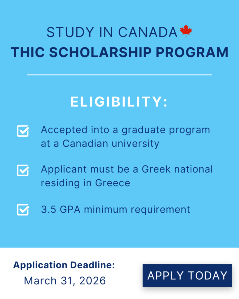 Πρόγραμμα Υποτροφιών του οργανισμού Hellenic Initiative Canada για το ακαδημαϊκό έτος 2026–2027 Δείτε εδώ πληροφορίες για τις υποτροφίες και οδηγίες για την υποβολή αιτήσεων (στα αγγλικά).