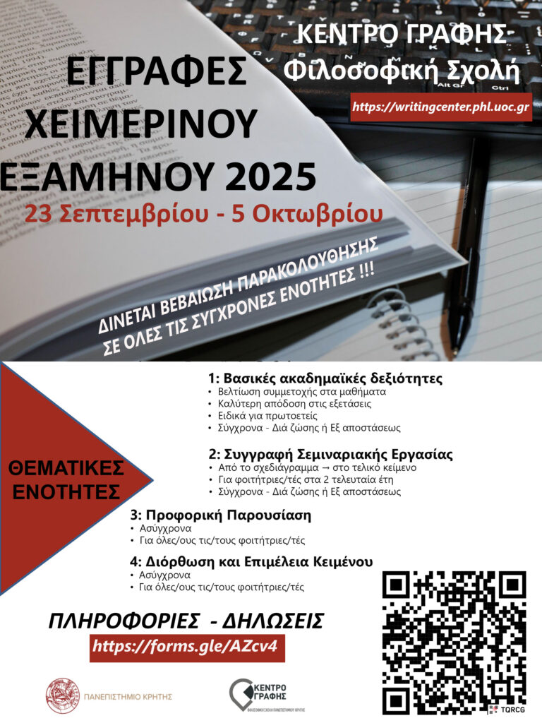 Ενημερώνονται οι φοιτήτριες και οι φοιτητές ότι τα μαθήματα του Κέντρου Γραφής