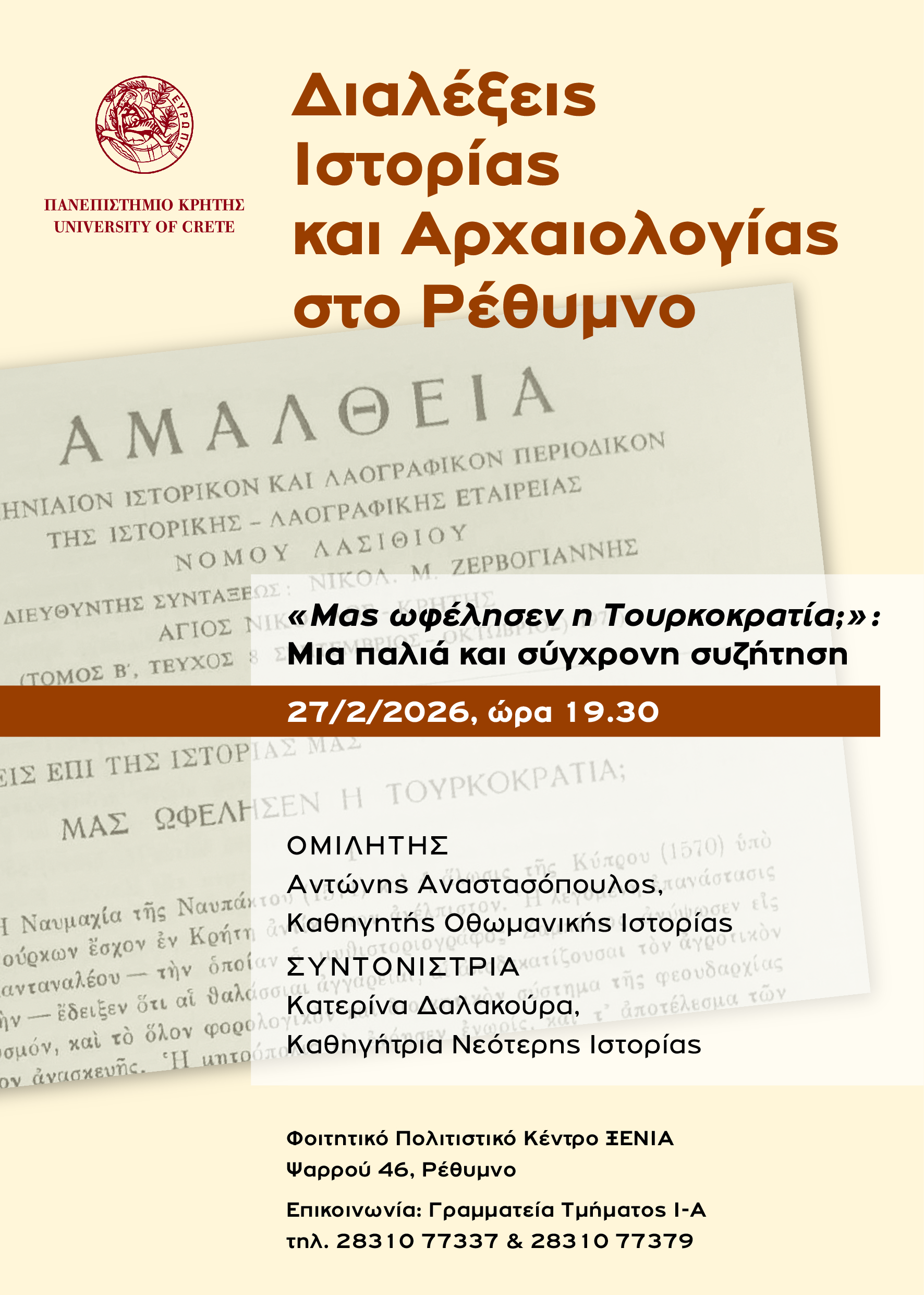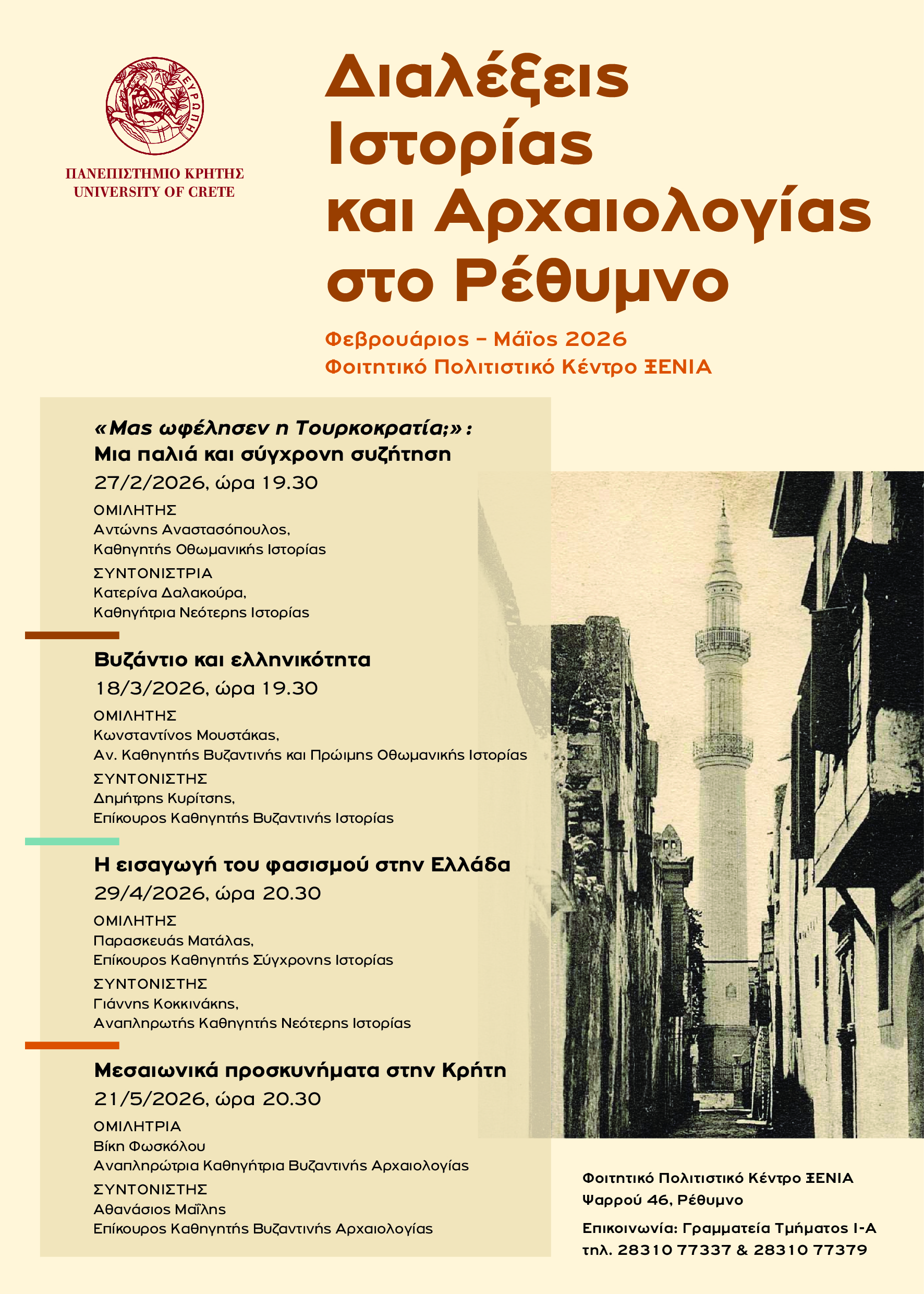Το Τμήμα Ιστορίας και Αρχαιολογίας οργανώνει μια σειρά διαλέξεων για το ευρύ κοινό στο Ρέθυμνο. Οι διαλέξεις θα πραγματοποιούνται στο Φοιτητικό Πολιτιστικό Κέντρο ΞΕΝΙΑ, στην οδό Ψαρρού 46, καθ’ όλη τη διάρκεια του εαρινού εξαμήνου.